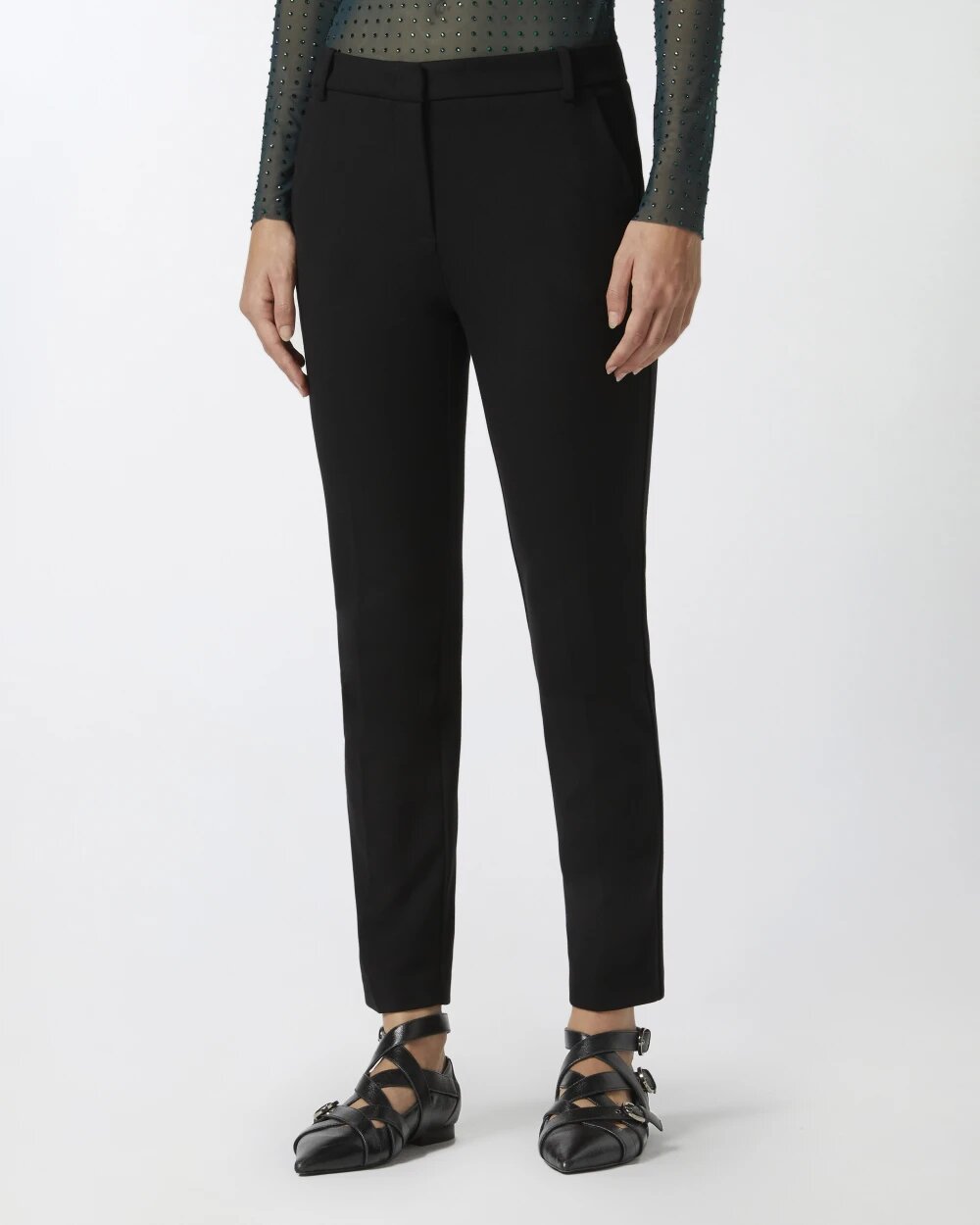 Pantaloni eleganti dalla silhouette cigarette-fit in tessuto tecnico di viscosa stretch lavorato a punto stoffa. Vita regular, completata da passanti per cintura, e tasche alla francese sui fianchi, a filetto sul retro. La gamba dalla linea dritta e affusolata è completata da piega centrale sia davanti che sul retro. Chiusura nascosta davanti. Con questi pantaloni è facilissimo costruire un outfit quotidiano con un tocco speciale, contemporaneo e trendy.