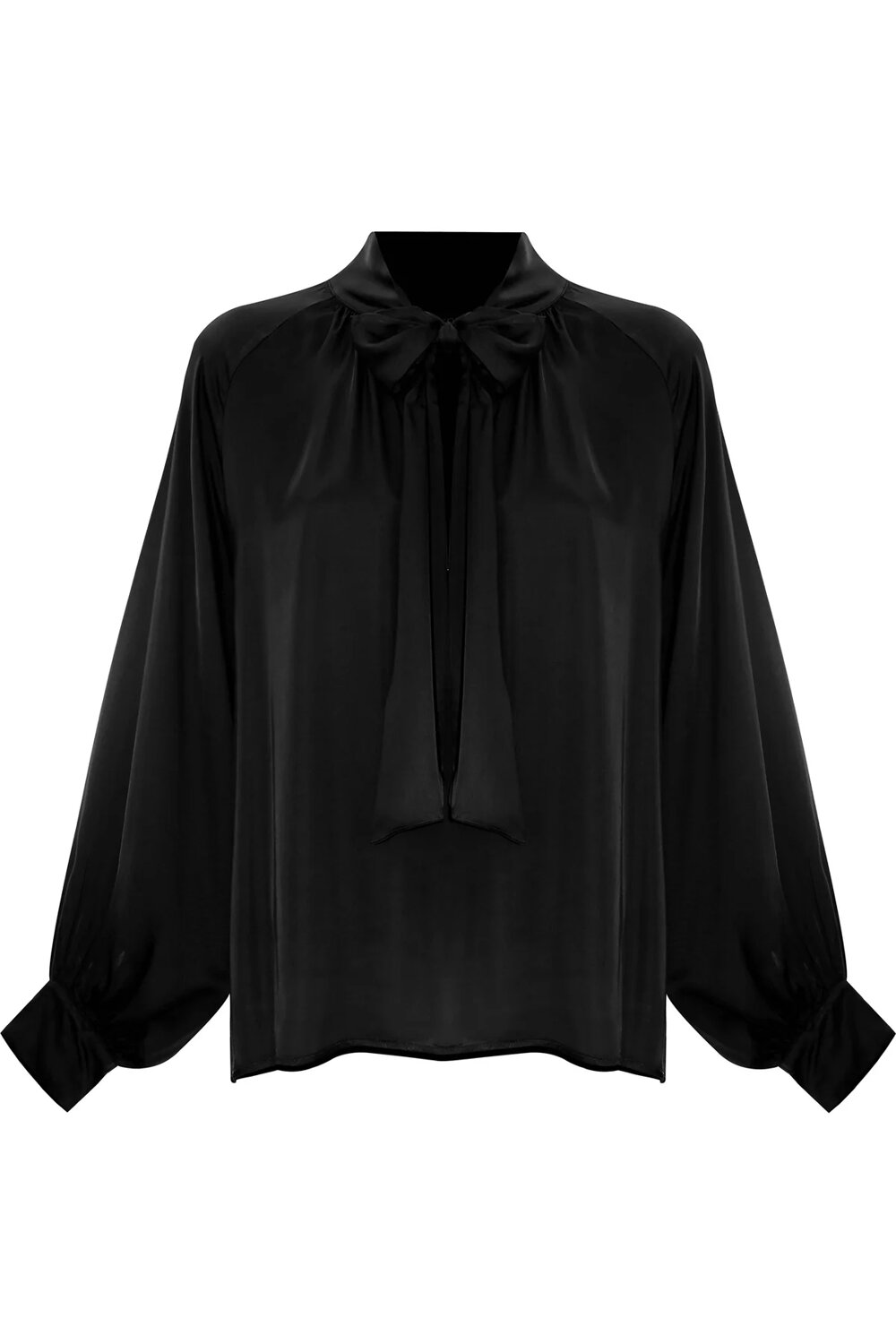 Questa blusa in pura viscosa a maniche lunghe è caratterizzata da una fusciacca da annodare sul collo, maniche con polsino a bottoni, linea ampia e vestibilità regolare.