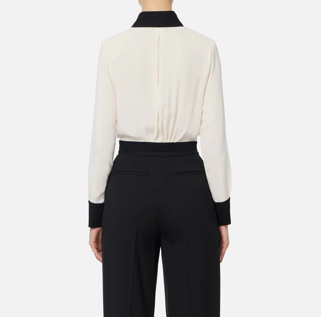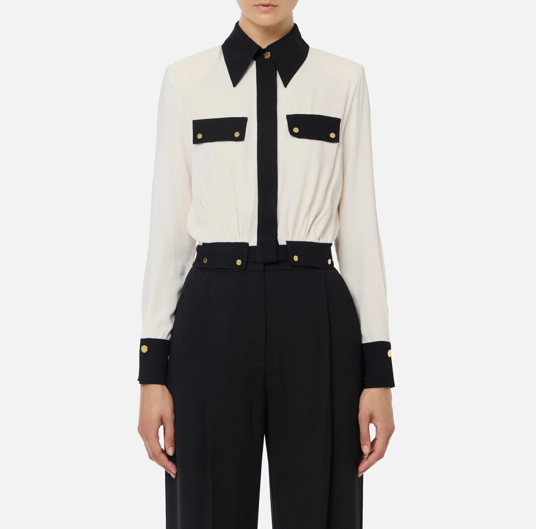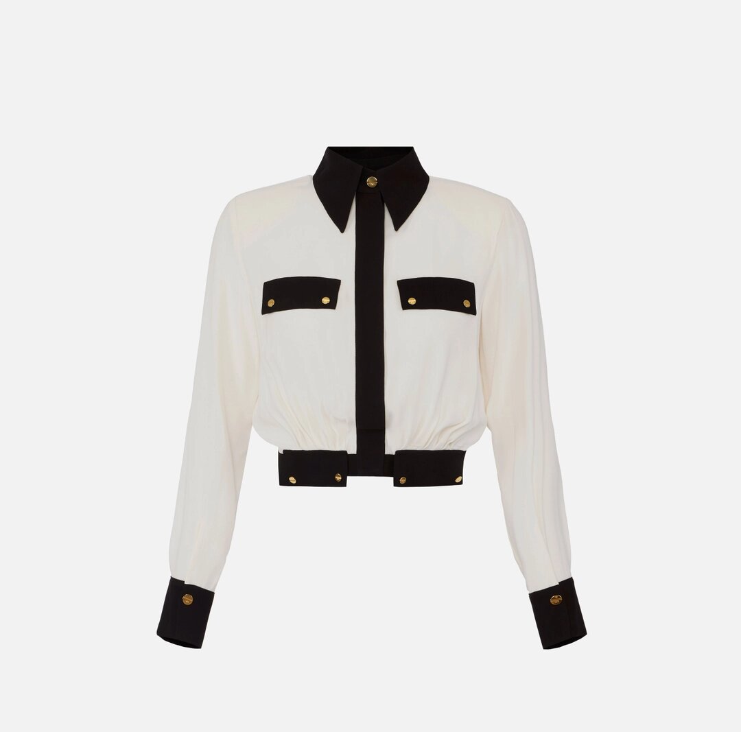 Camicia cropped in georgette dalla vestibilità slim. Ha colletto classico e maniche lunghe. Gli elementi a contrasto creano un dinamico motivo bi-color. Note di luce coi bottoni in metallo dorato.