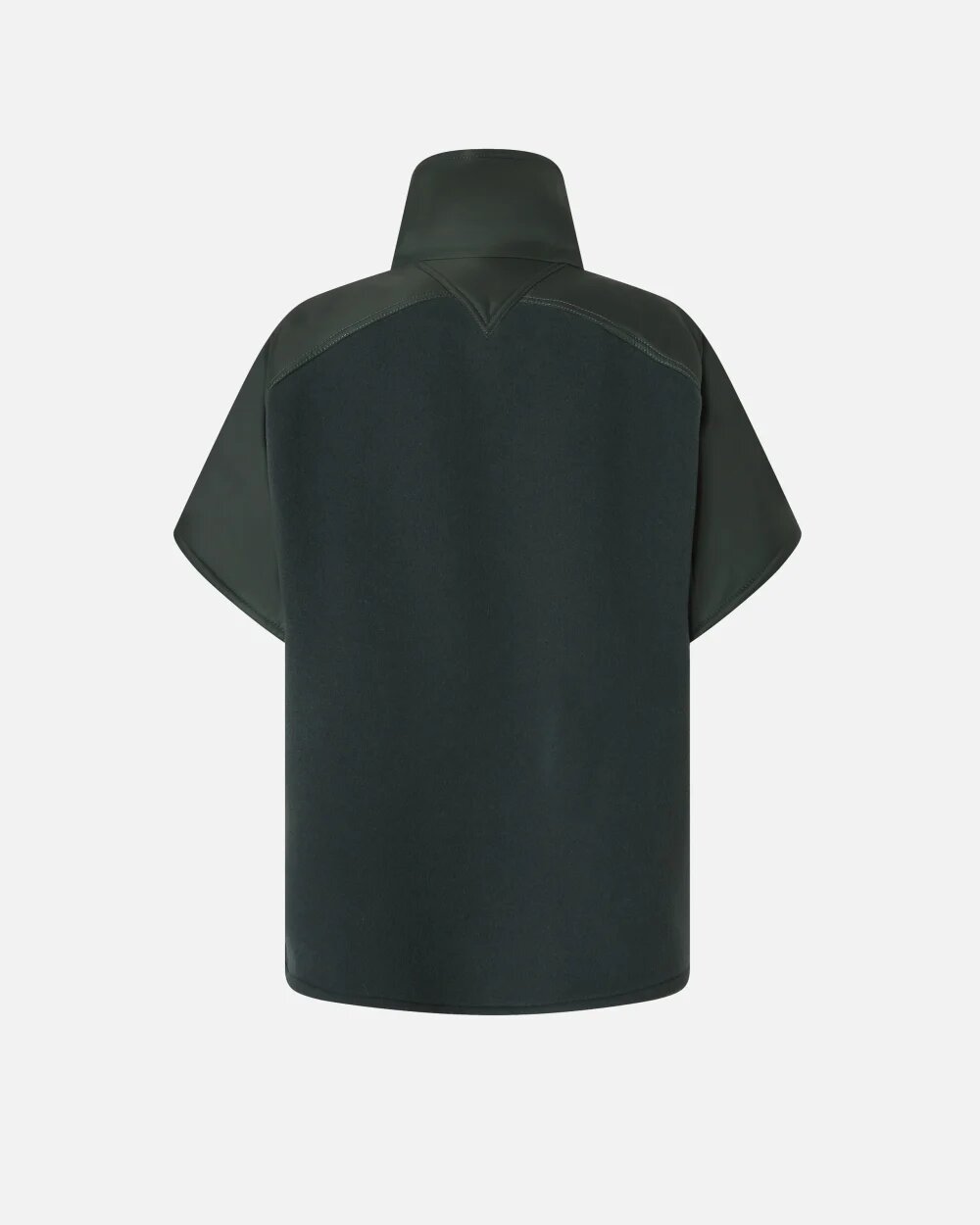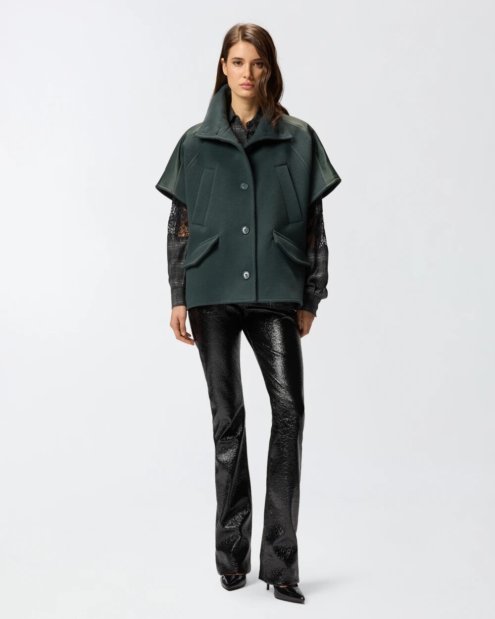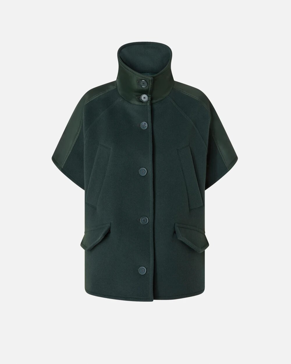 Cappa corta con maniche corte e doppie tasche a pattina e a filetto sul davanti. Il modello è realizzato in caldo e morbido panno di misto lana con collo alto, spalle e carré in satin tecnico a contrasto. Chiusura con bottoni davanti. Grazie al suo design inedito ma funzionale, questa mantella è pronta a diventare il tuo nuovo capospalla preferito in puro stile PINKO.