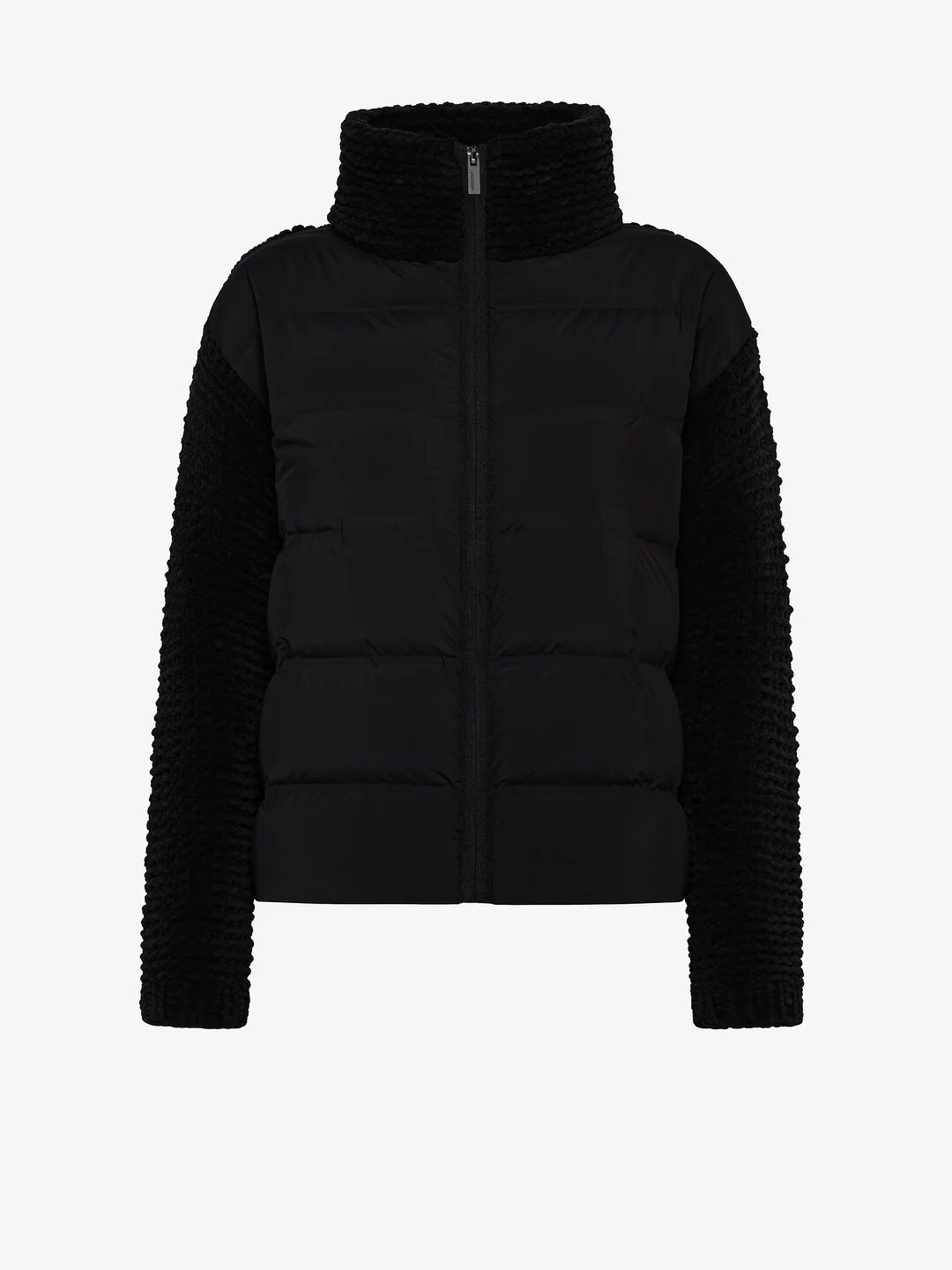 Iconica e distintiva, questa maglia hybrid dal design innovativo rappresenta un perfetto equilibrio tra stile e funzionalità. La parte frontale presenta la nitida texture a canali tubici senza impunture, che racchiudono l’imbottitura in piuma d’anatra 90/10. Questa si fonde con eleganza al retro e alle maniche in ciniglia a punto links, materica e avvolgente. Leggera e sorprendentemente versatile, la creazione si distingue per il taglio boxy, arricchito da un collo alto e strutturato, pensato per offrire comfort e definizione. Indossata con un pantalone flare, crea un look dinamico e contemporaneo, perfetto per affrontare la stagione con stile deciso e sofisticato.