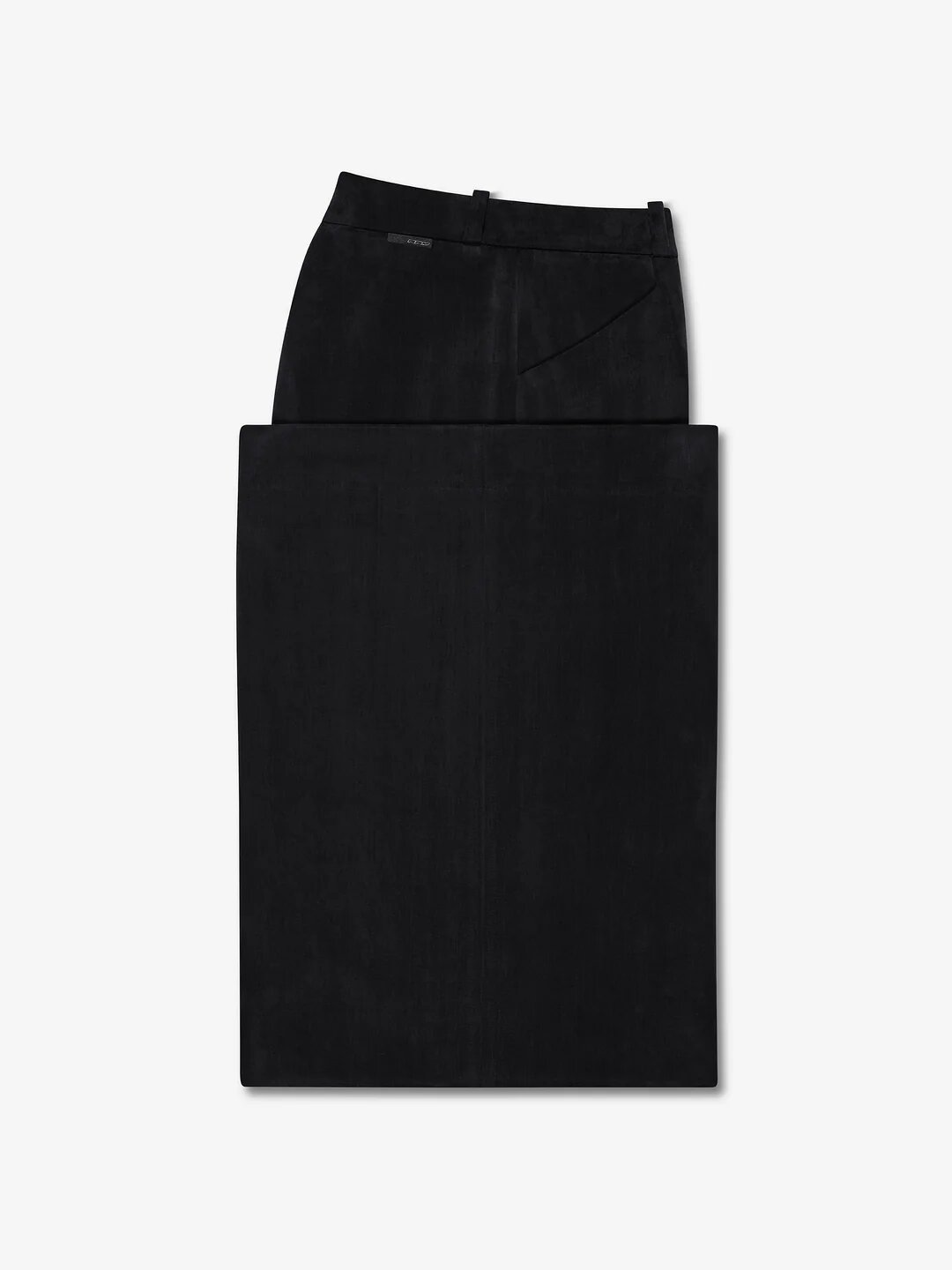 Questi pantaloni palazzo celebrano l’eleganza nella sua forma più fluida e armoniosa. Caratterizzati da una linea ampia e scivolata, accompagnano il movimento con naturalezza, offrendo un perfetto equilibrio tra comfort e stile. Realizzati in pregiato tessuto naturale Cupro, dal tocco setoso e dalla leggerezza impalpabile, rappresentano un elemento essenziale del guardaroba contemporaneo. Le tasche alla francese, sapientemente integrate nella struttura sottolineano la cura sartoriale del design. Il punto vita alto, ispirato al fit raffinato degli anni Sessanta, dona slancio alla figura e ne valorizza con discrezione la silhouette. Versatili e distintivi, questi pantaloni si adattano alle interpretazioni più differenti, dallo stile glam più sofisticato allo sporty-chic più attuale. Indossati con la maglia a collo alto con stampa geometrica della collezione, creano un insieme elegante e di carattere.