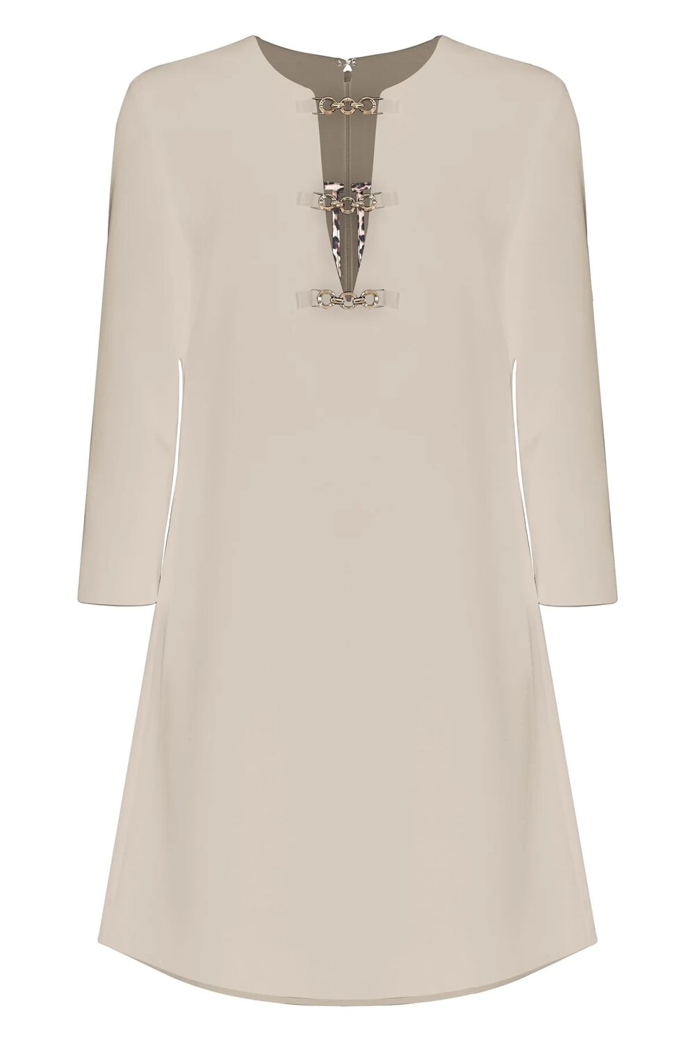 Elegante e versatile, questo abito corto è caratterizzato dallo scollo a V impreziosito da catene dorate. Il capo presenta una linea scivolata e fondo svasato.