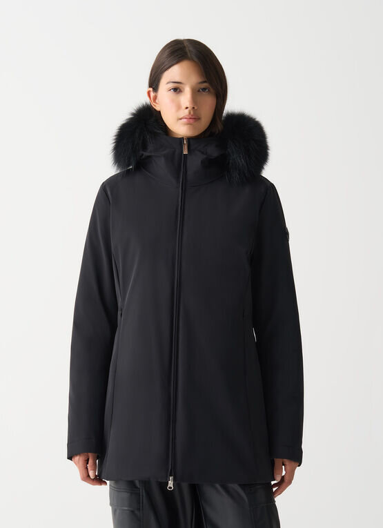 Tecnico e romantico, il piumino da donna con protezione impermeabile e cappuccio in pelliccia sintetica unisce stile e comfort per le giornate fredde.