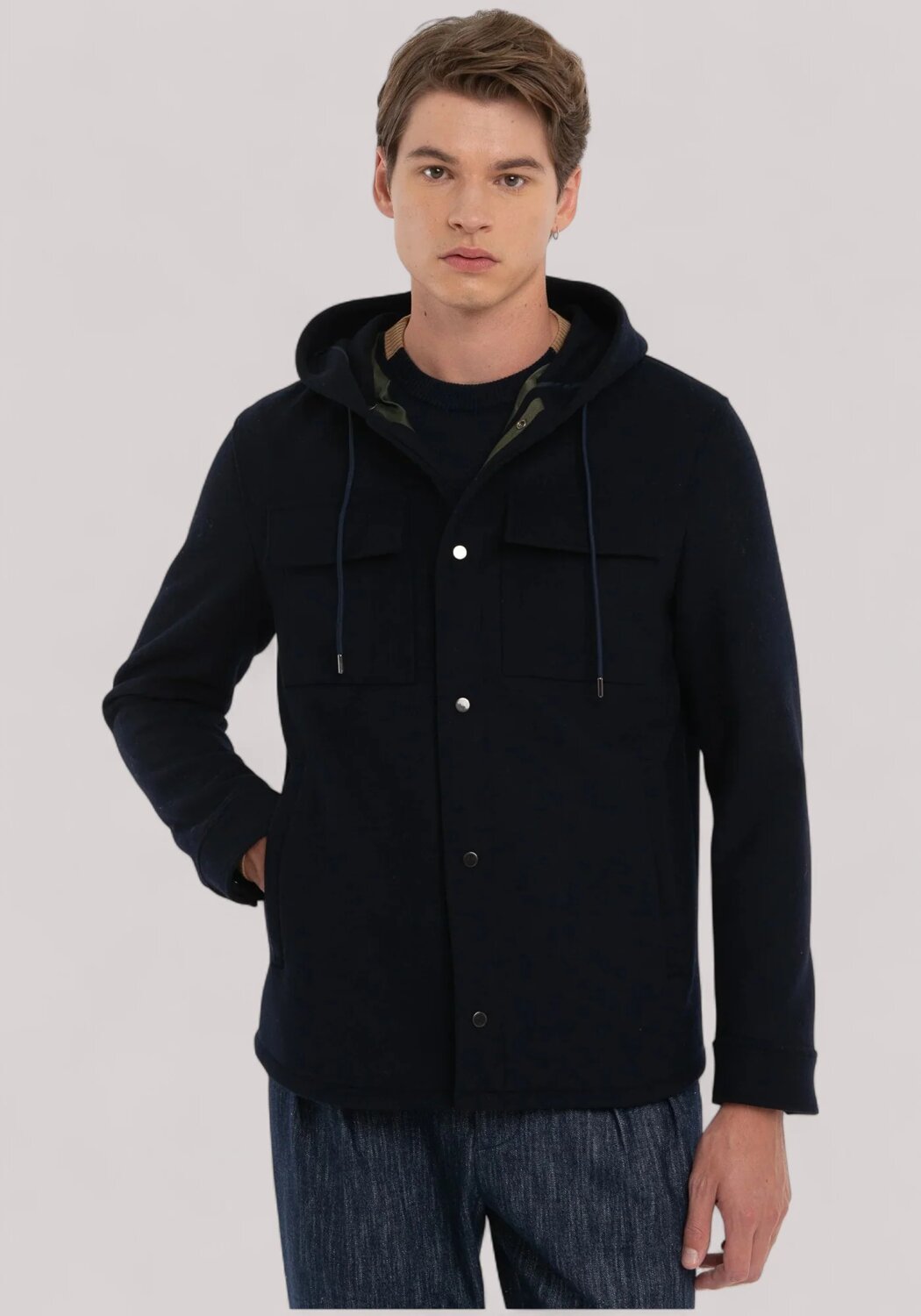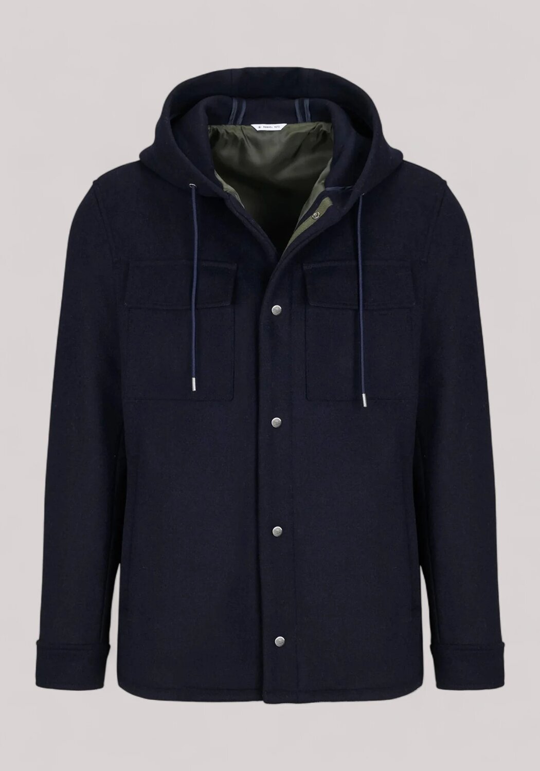 Giubbino foderato con cappuccio, chiusura con bottoni, due tasche ai fianchi e due a toppa con pattina frontali,bottoni ai polsi, finiture con impunture. Panno in misto lana