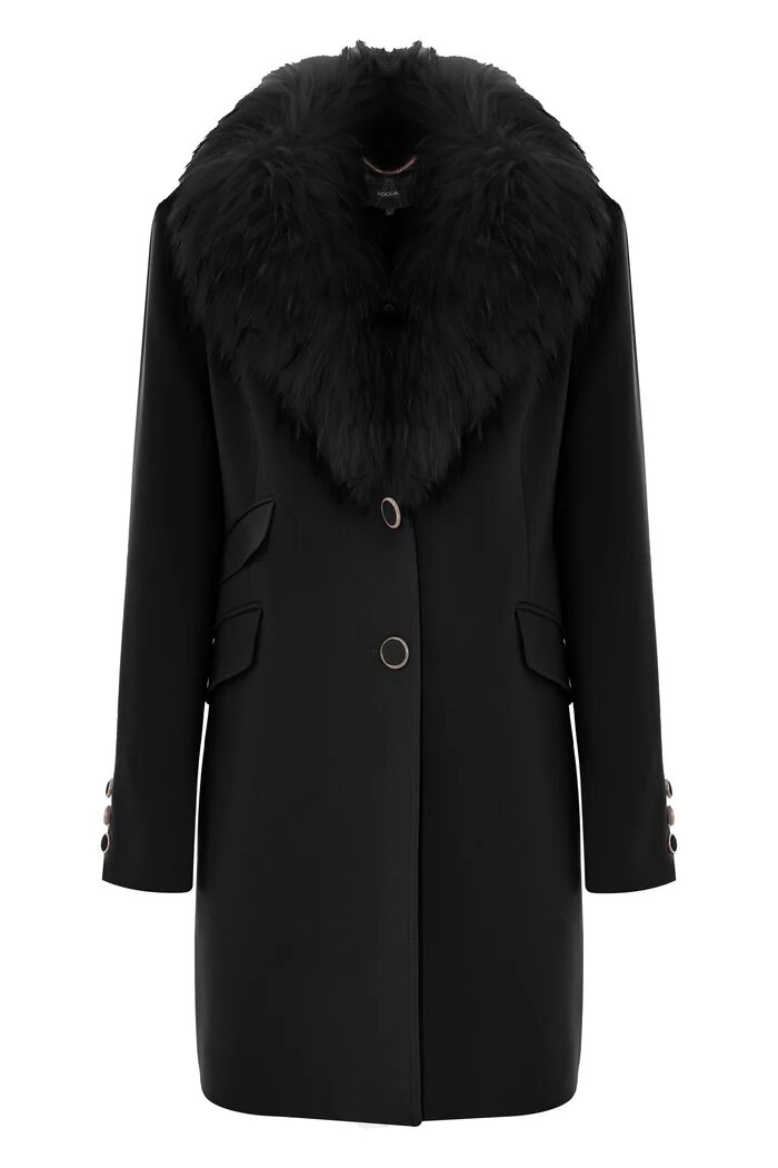 Taglio sartoriale per questo cappotto impreziosito dal collo in pelliccia e dalle tasche con pattina che regalano stile e movimento al capo. Il modello presenta una vestibilità regolare e chiusura con bottoni rivestiti.