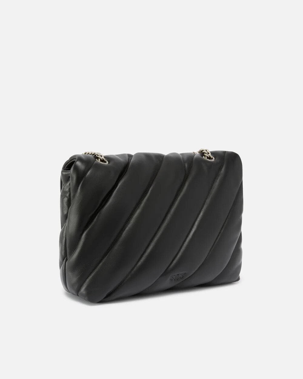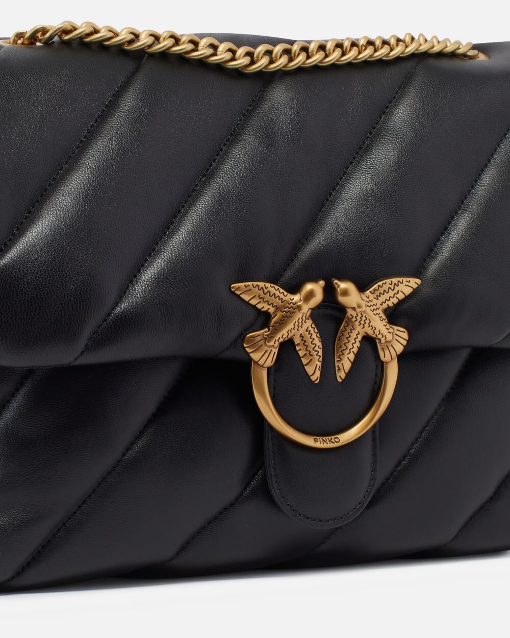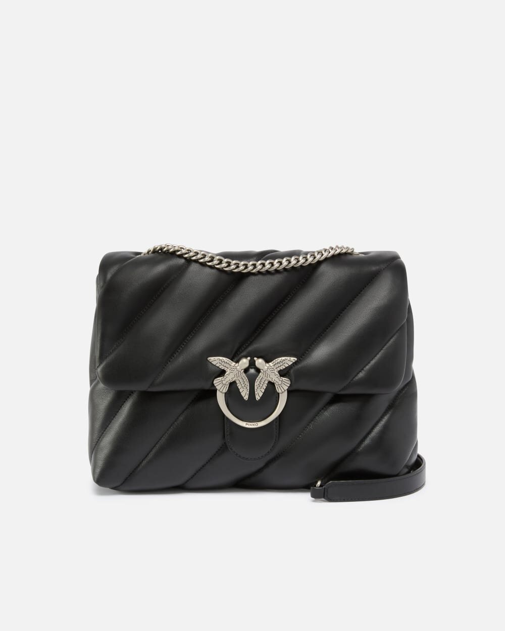 Borsa grande a tracolla Big Love Bag Puff in morbida nappa caratterizzata da maxi trapuntatura obliqua. La chiusura è completata dall’iconica fibbia in metallo Love Birds Diamond Cut. L’interno è foderato in microfibra scamosciata e comprende tramezza chiusa con zip e tasca a parete. La tracolla combina la classica catena metallica rotonda al pratico spallaccio in nappa. Attiva la tua borsa PINKO: verifica l’autenticità del tuo prodotto e accedi all’esperienza personalizzata avvicinando il tuo smartphone al ricamo Love Birds che trovi sul retro della borsa!