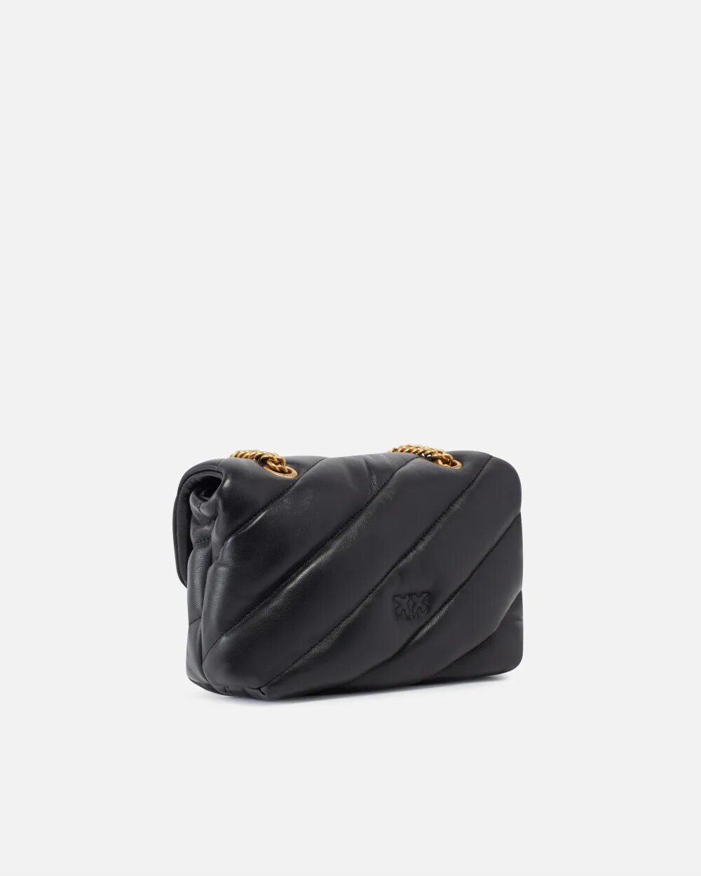 Borsa piccola a tracolla Mini Love Bag Puff realizzata in morbida nappa trapuntata con pattern obliquo. La chiusura con patta e bottone automatico è completata dall’iconica fibbia in metallo Love Birds Diamond Cut. L’interno comprende tramezza chiusa con zip e tasca a parete ed è foderato in microfibra scamosciata. La borsa è completa di tracolla, che combina la classica catena metallica rotonda al pratico spallaccio in nappa.