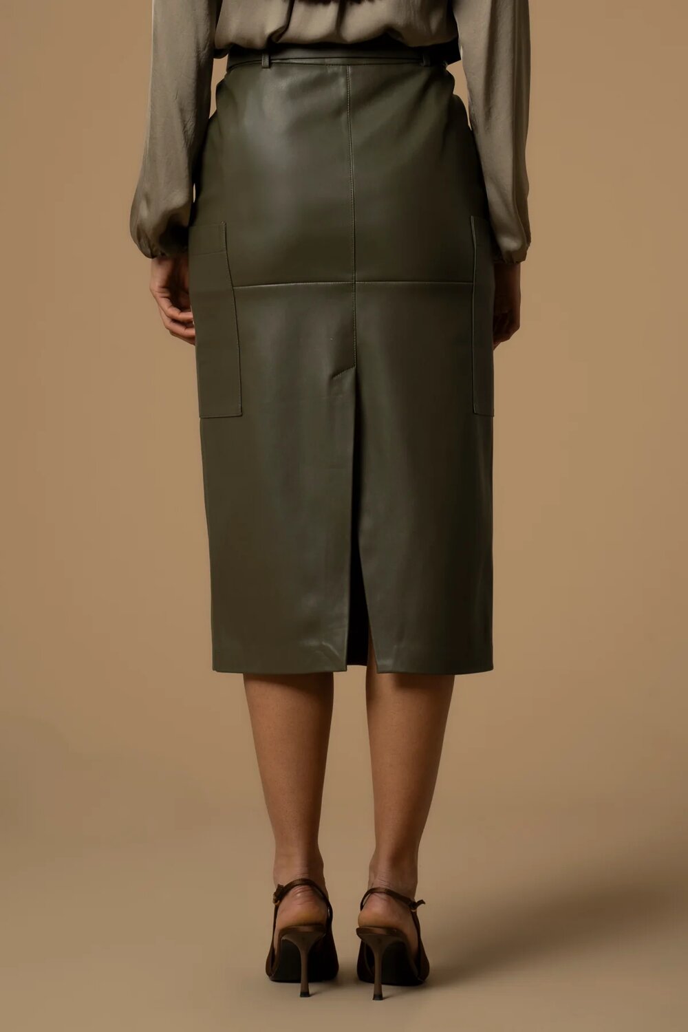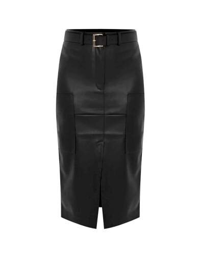 Il tessuto in ecopelle regala a questa a questo gonna longuette grinta e carattere. Elegante e versatile, presenta uno spacco e ampie tasche sul davanti, chiusura con zip e cintura in vita.