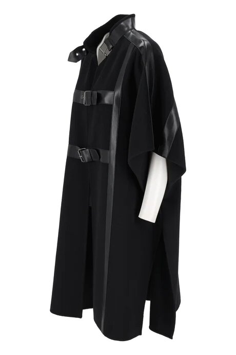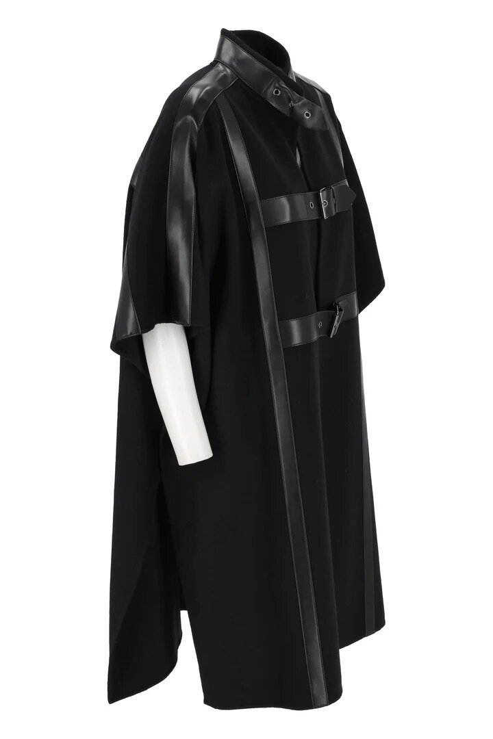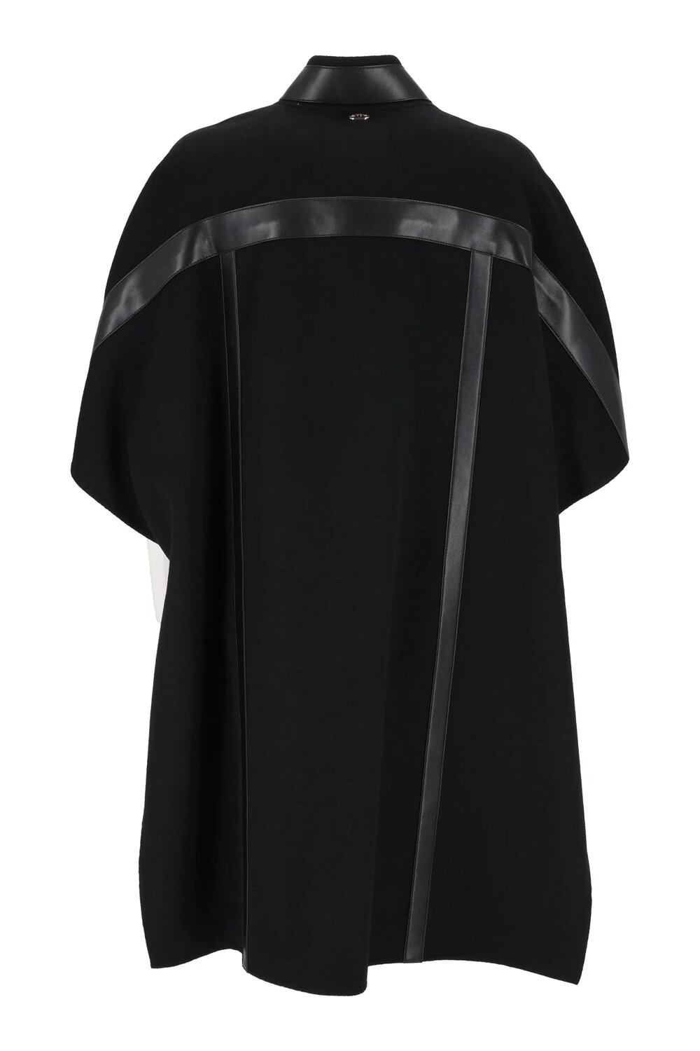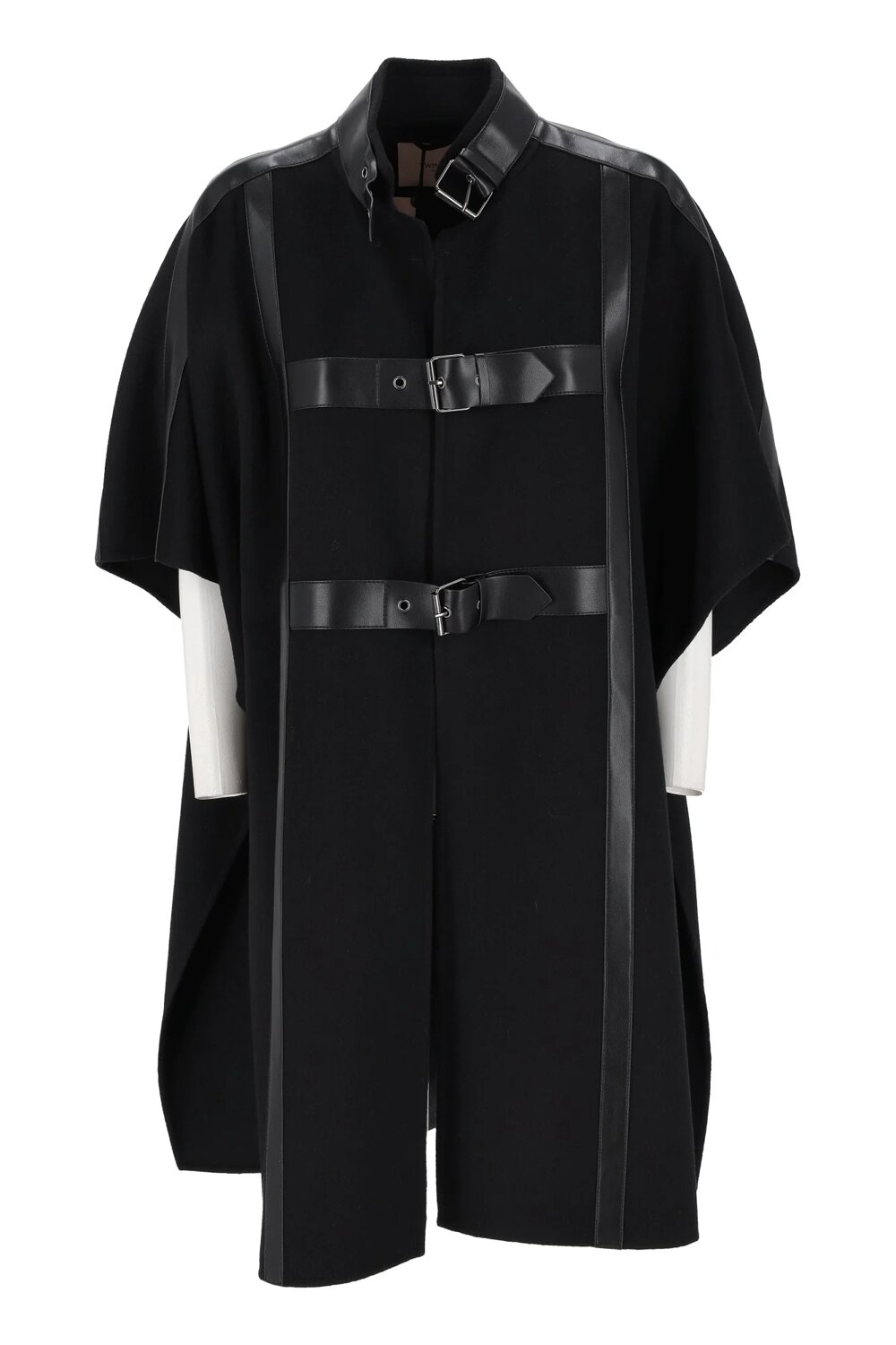 Mantella in panno double rifinita da dettagli effetto pelle. Ha collo alto, chiusura con cinturini e fibbie, maniche corte a kimono, spacchi laterali al fondo, linea ampia.