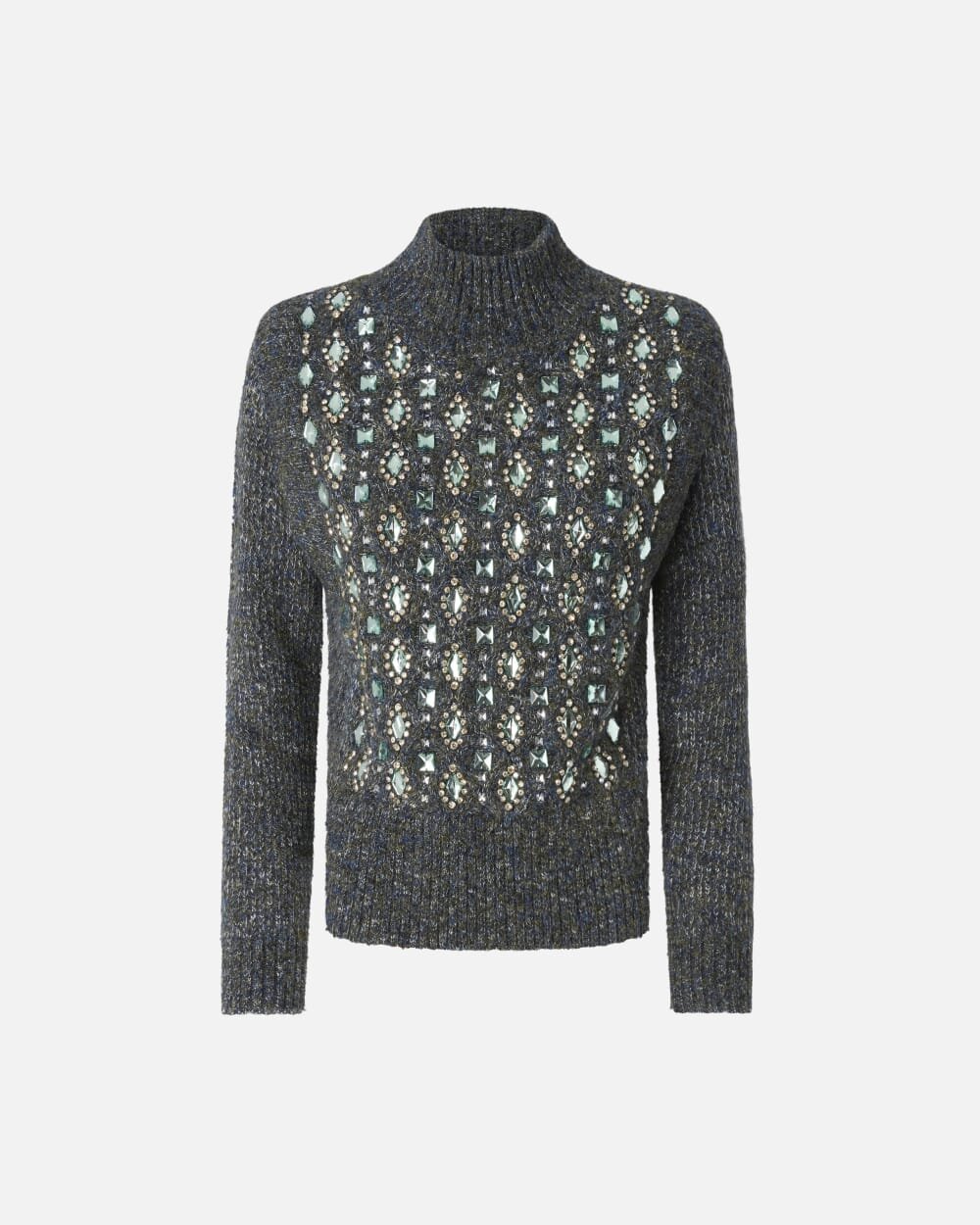 Maglia dolcevita in pregiato filato mouliné. Il frontale è impreziosito da un motivo geometrico di cristalli e perle che formano un pattern scintillante e prezioso. La silhouette fitted presenta collo alto a coste e maniche lunghe, mentre i bordi lavorati a costina definiscono la linea con eleganza sartoriale. Il gioco cromatico tra il filato melange e le applicazioni luminose crea un contrasto raffinato e distintivo. La lavorazione artigianale e l’attenzione ai dettagli rendono questo pezzo unico nel suo genere. Perfetta abbinata a una gonna midi in pelle per un look serale glamour o a pantaloni sartoriali per un outfit che unisce comfort e preziosità.