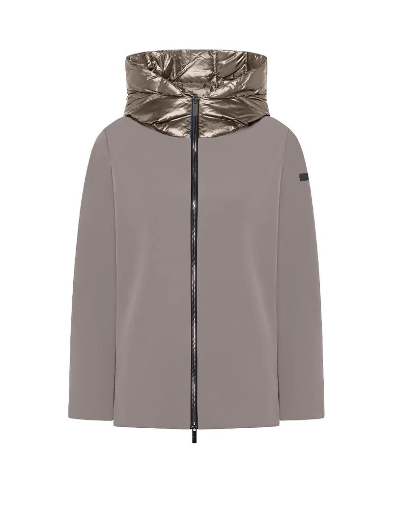 La giacca, dalla linea pulita e minimale, si caratterizza per l’abbinamento di tessuti dalle consistenze e luminosità differenti. L’extra matt dell’esterno in Montecristo sul davanti e sulle maniche, morbido al tatto e gradevolmente elastico all’indosso, gioca a contrasto con l’aspetto glossy dei canali tubici sul retro e sull’avvolgente cappuccio che incornicia morbidamente il viso. Privi di impunture, questi racchiudono la morbida imbottitura in piuma d’anatra in una texture senza soluzione di continuità. La lunghezza ai fianchi e il fit regolare rendono la giacca particolarmente confortevole e versatile. La chiusura a zip centrale a doppio cursore costituisce un elemento distintivo di design, affiancata dalle tasche laterali con zip invisibili. Il logo a microiniezione nero sulla manica sinistra completa un capospalla che può essere indossato in abbinamento sia a capi formali, sia casual. Ideale per una giornata autunnale accostata al pantalone a sigaretta dal taglio maschile.