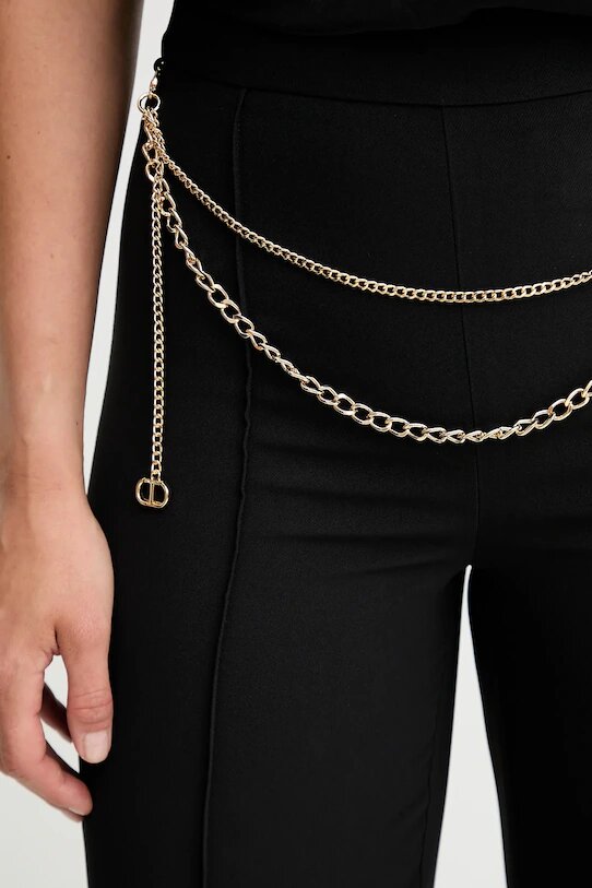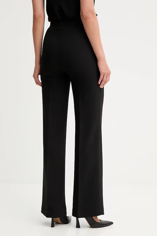 Pantaloni in crêpe cady con cintura rimovibile in catena davanti e dettaglio Oval T. Ha chiusura con zip invisibile al fianco, nervatura centrale, linea a palazzo.