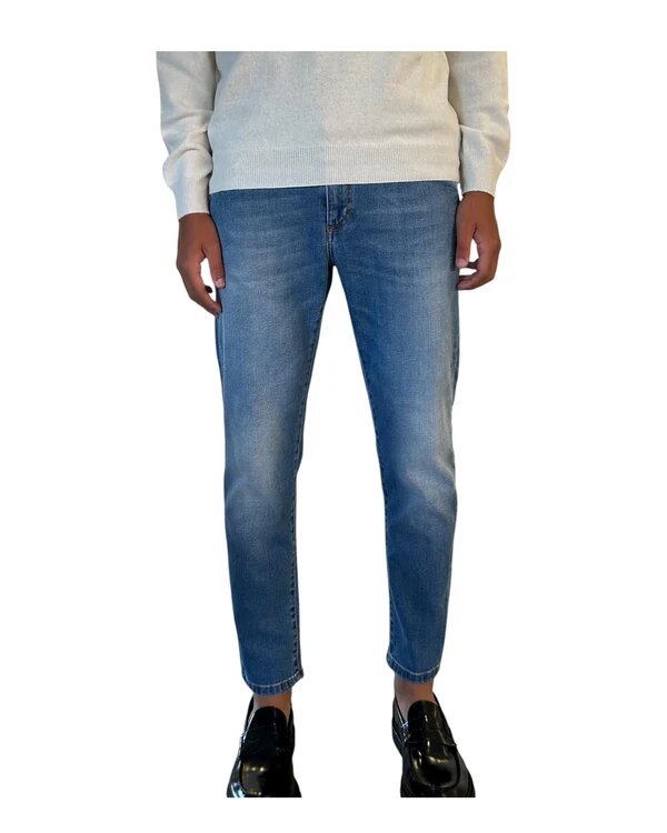 Jeans da uomo blu denim. Modello classico cinque tasche; chiusura con zip e bottone; patch Camouflage applicata sul retro. Capo eco-sostenibile, pensato e ideato nel rispetto dell’ambiente, utilizzando materiali di recupero.