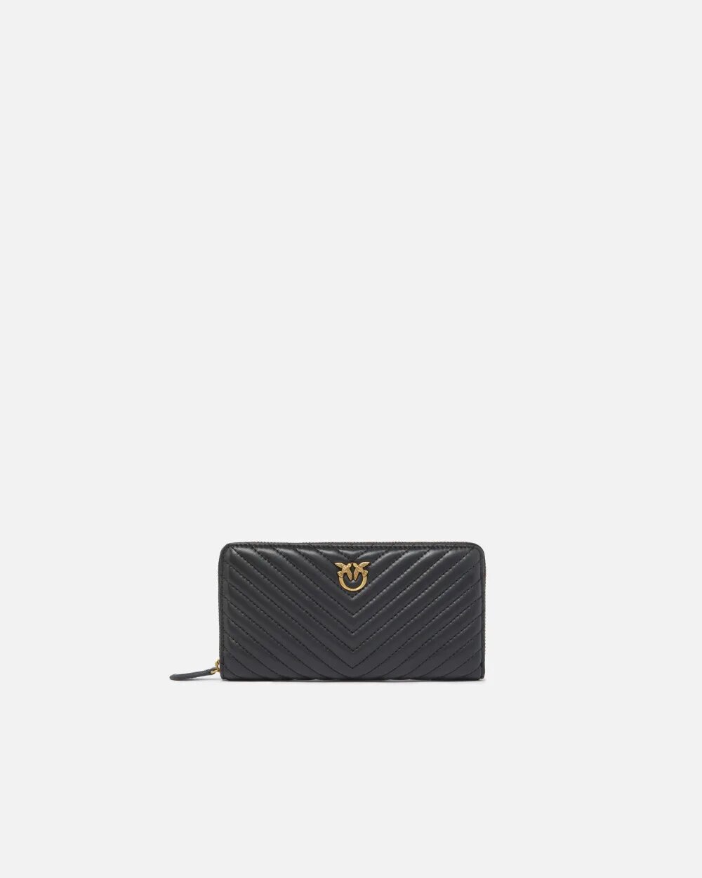Portafoglio zip-around in nappa con trapuntatura pattern chevron personalizzato con placchetta Love Birds Diamond Cut su base in pelle. L’interno è foderato in microfibra ed è diviso in quattro scomparti, di cui uno chiuso con zip e due con spazi per carte di credito.
