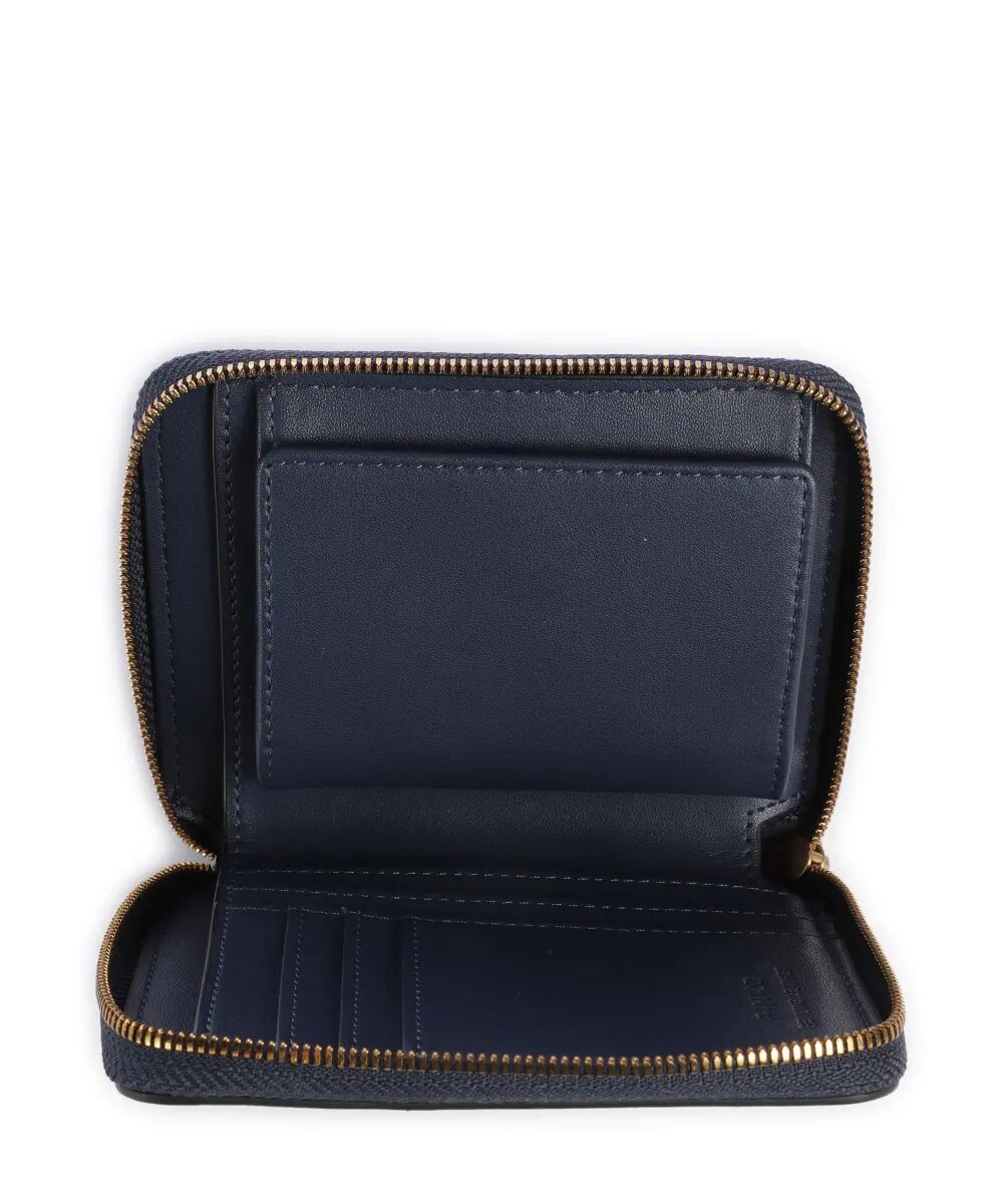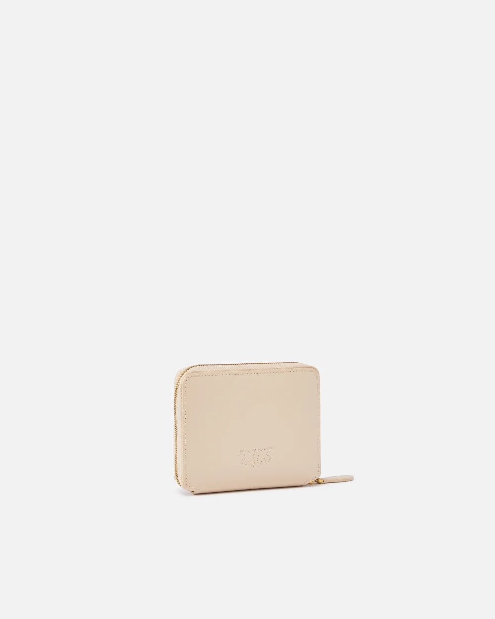 Portafoglio zip-around di forma quadrata in morbida pelle mano seta, personalizzato con placchetta Love Birds Diamond Cut su base in pelle. L’interno è foderato in polycotton. Chiusura con zip.