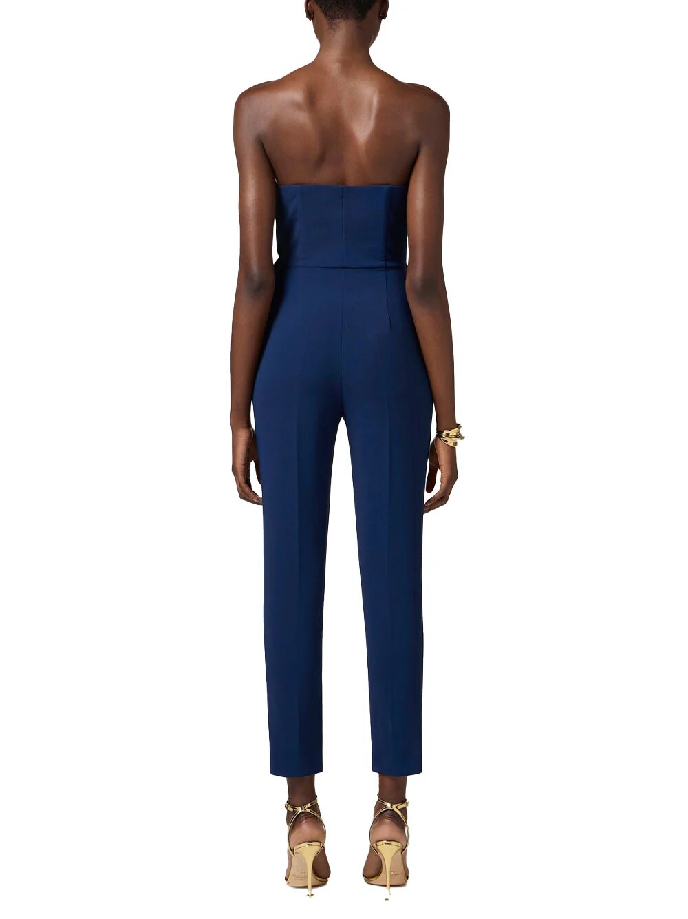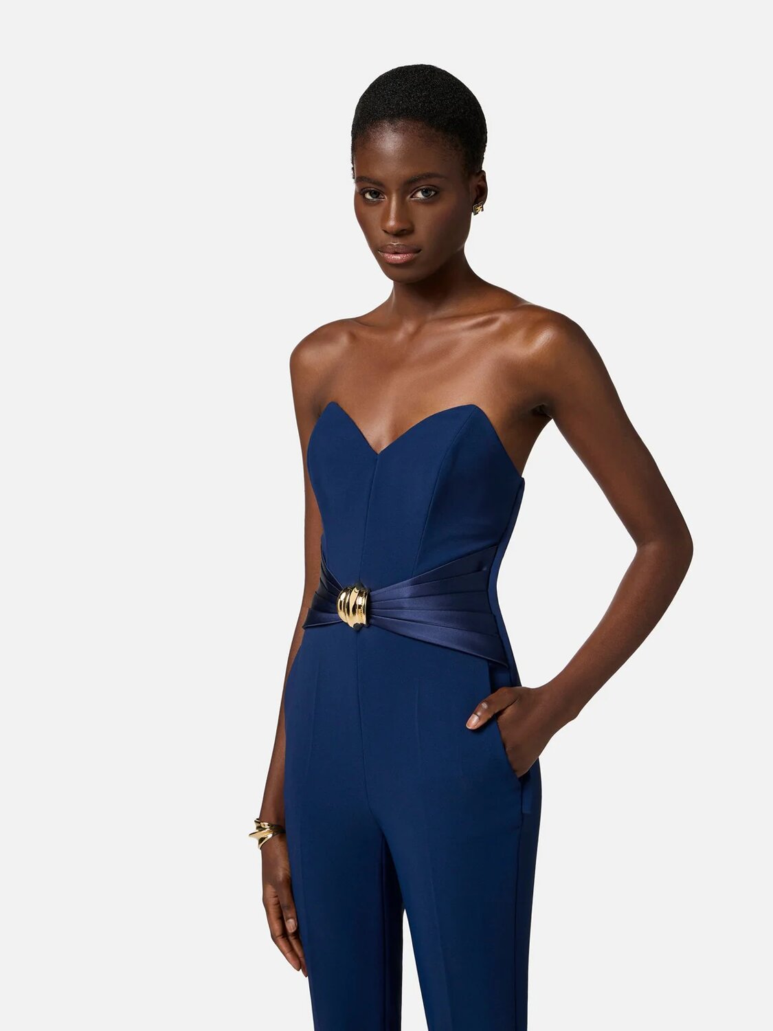 Tuta in crêpe fluido con fascione in duchesse che dona l’effetto di un macro fiocco, impreziosito dalla decorazione gioiello in metallo dorato sul nodo.